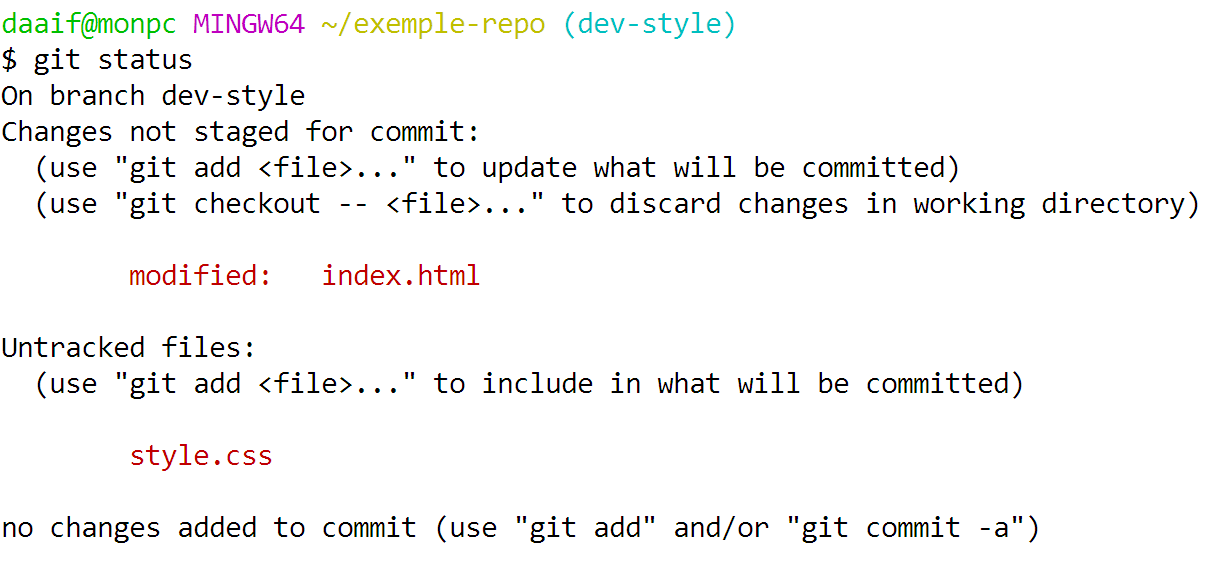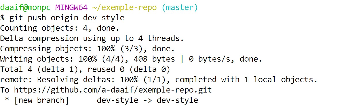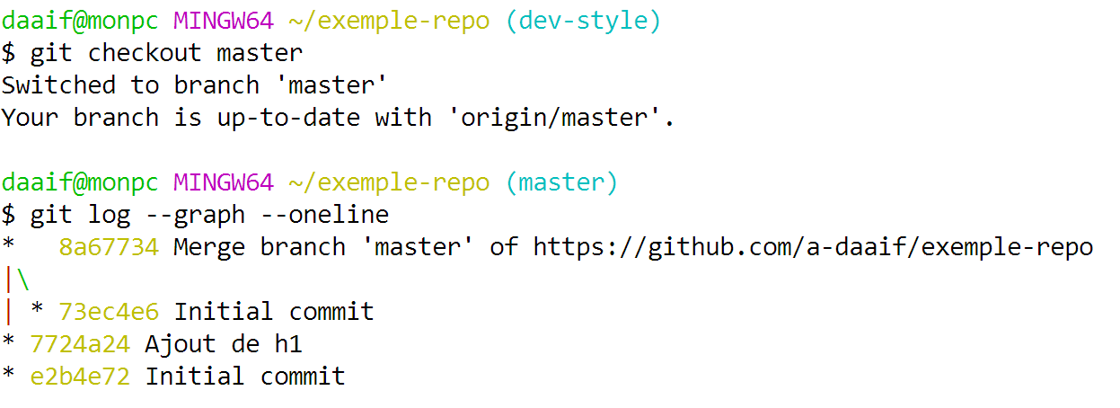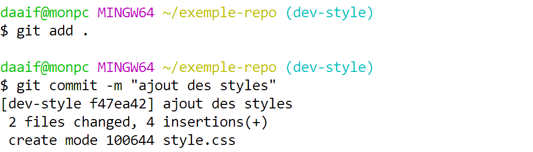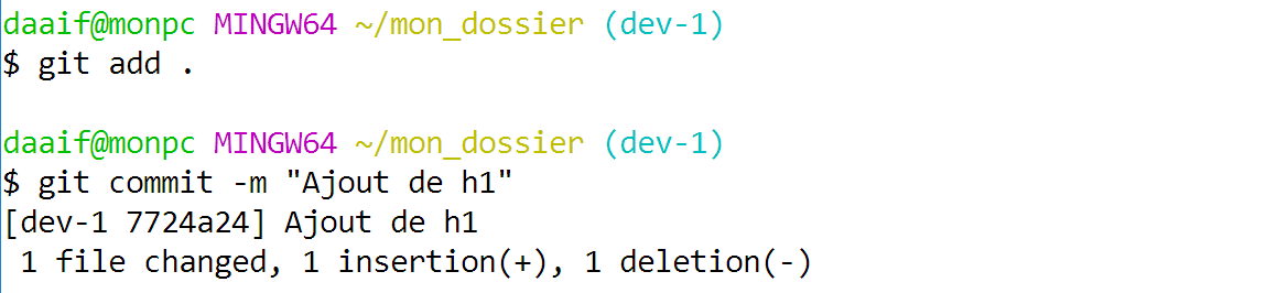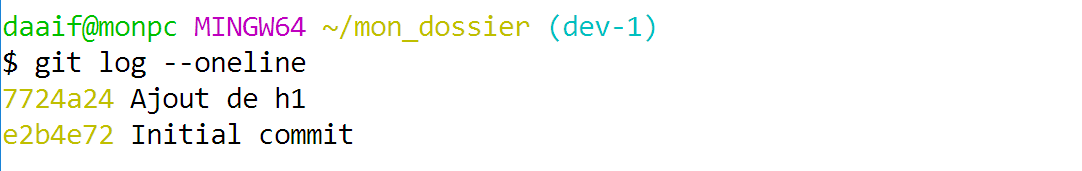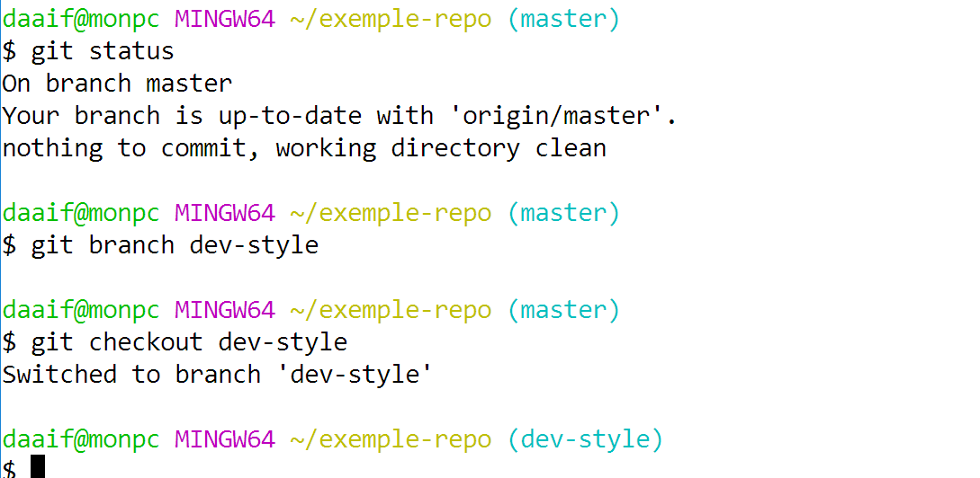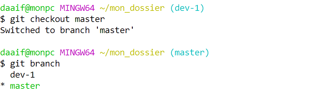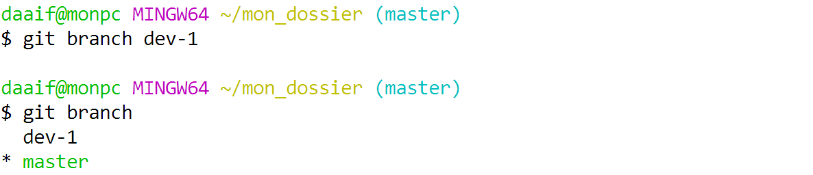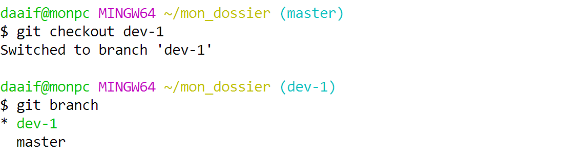 git branch permet de voir les branches du dépôt.git branch dev-1 ajoute la branche dev-1.