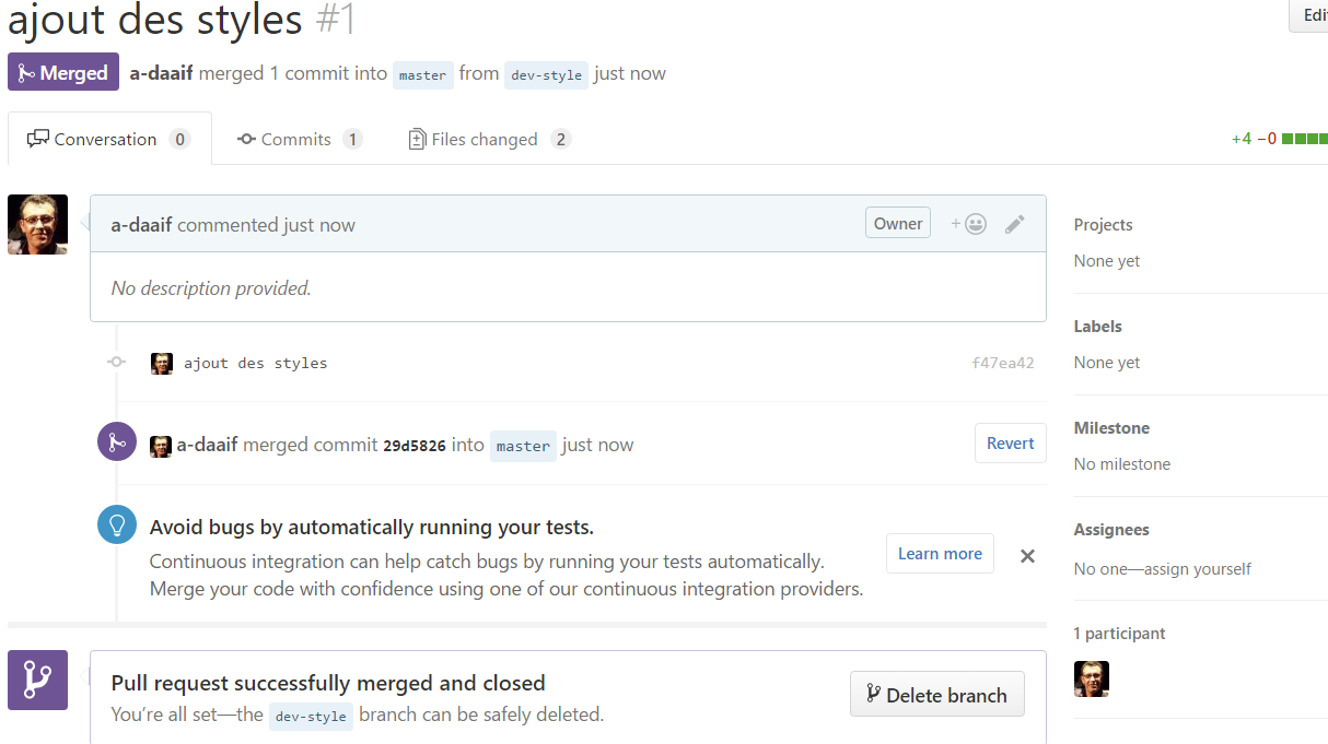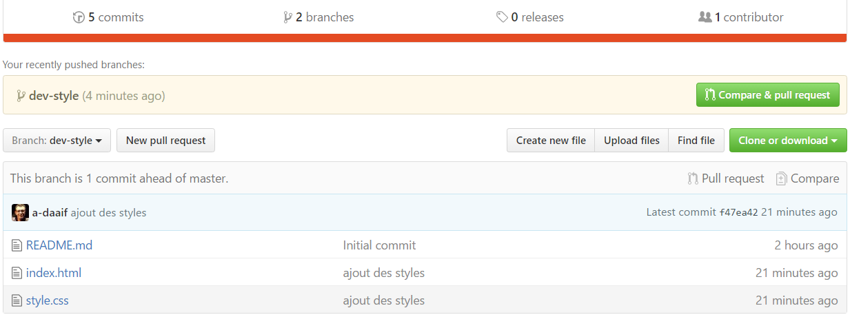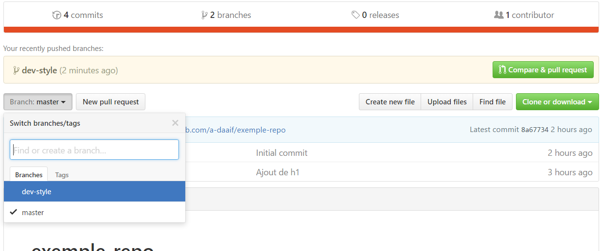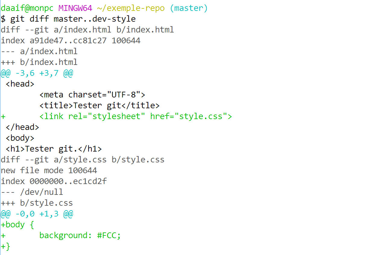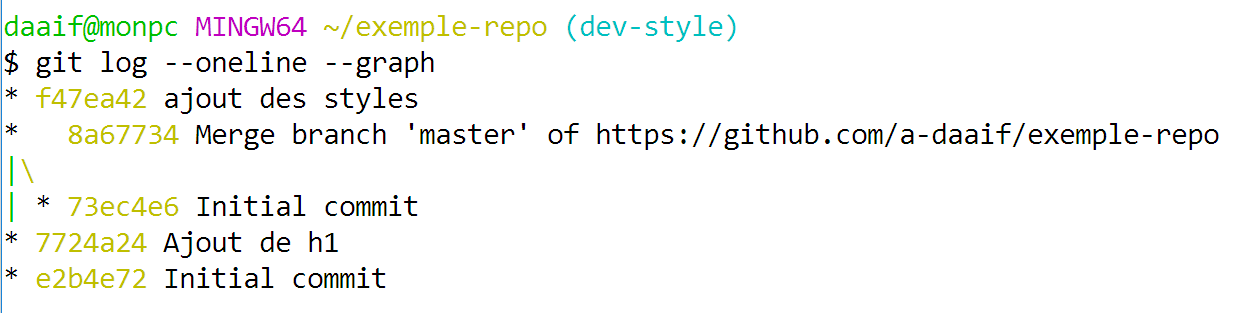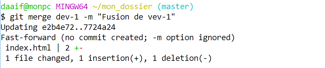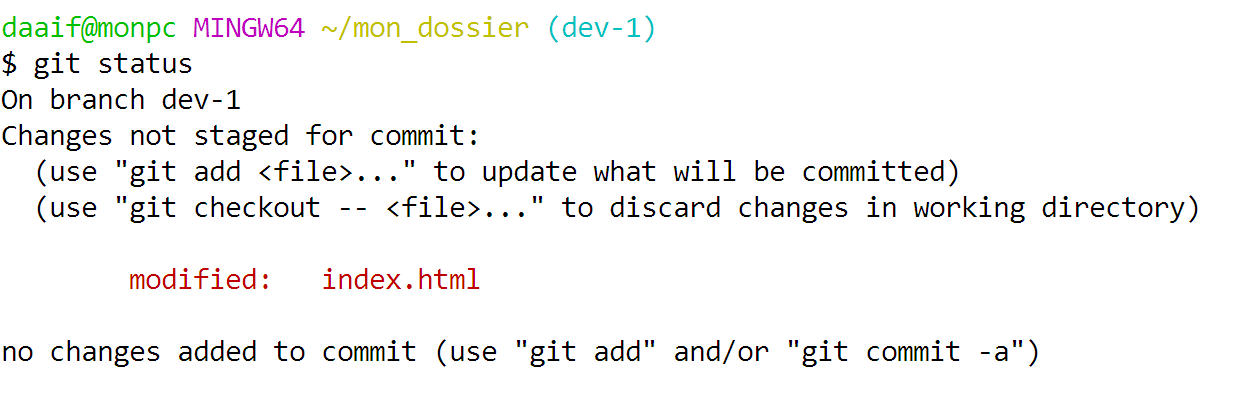 git branch permet de voir les branches du dépôt.git branch dev-1 ajoute la branche dev-1.